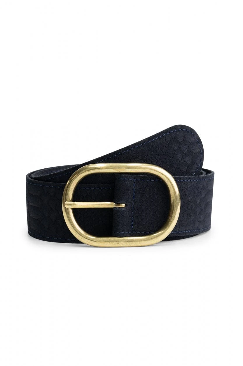 A classic suede navy blue belt to style your outfit! The belt has a snake texture and comes with a golden buckle with rounded corners. This sustainable belt is produced in the Netherlands.