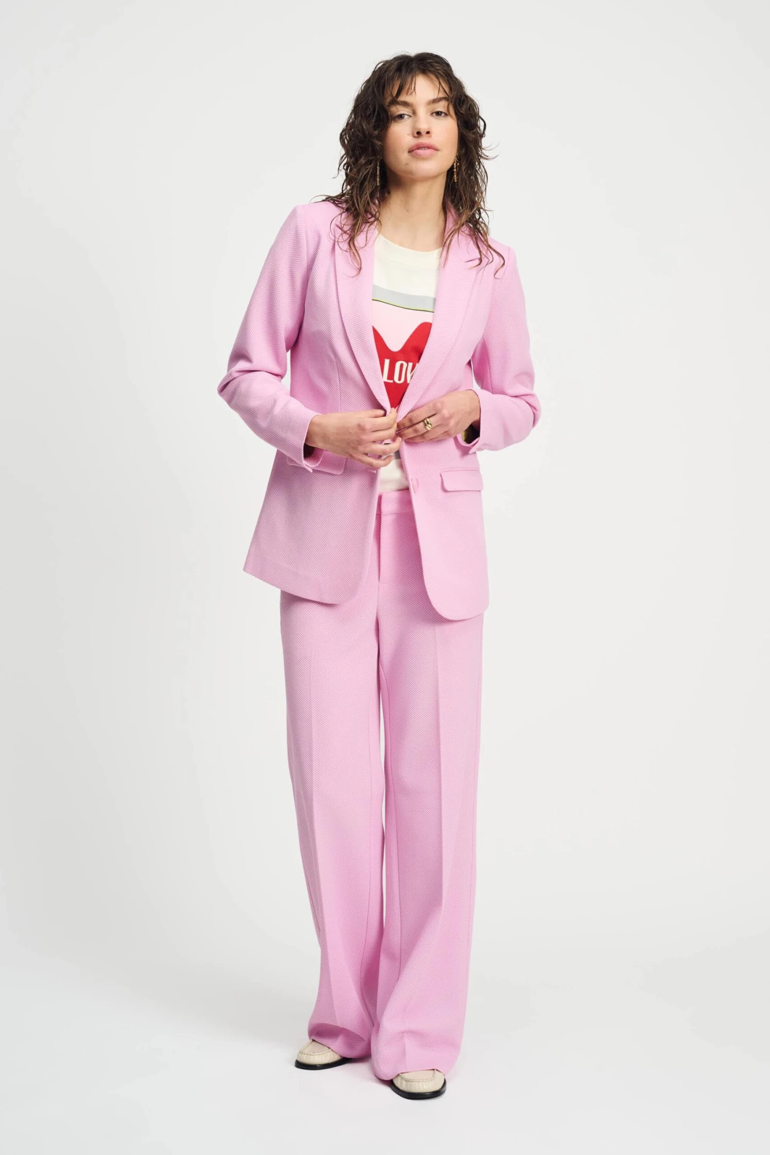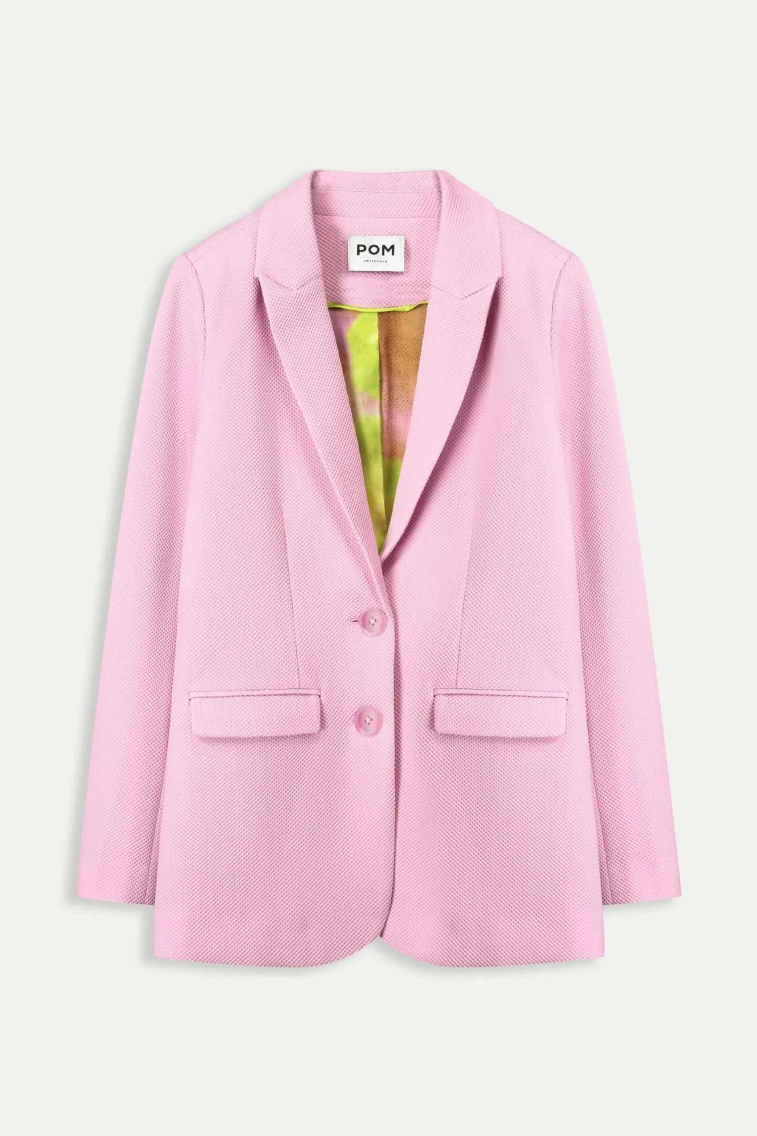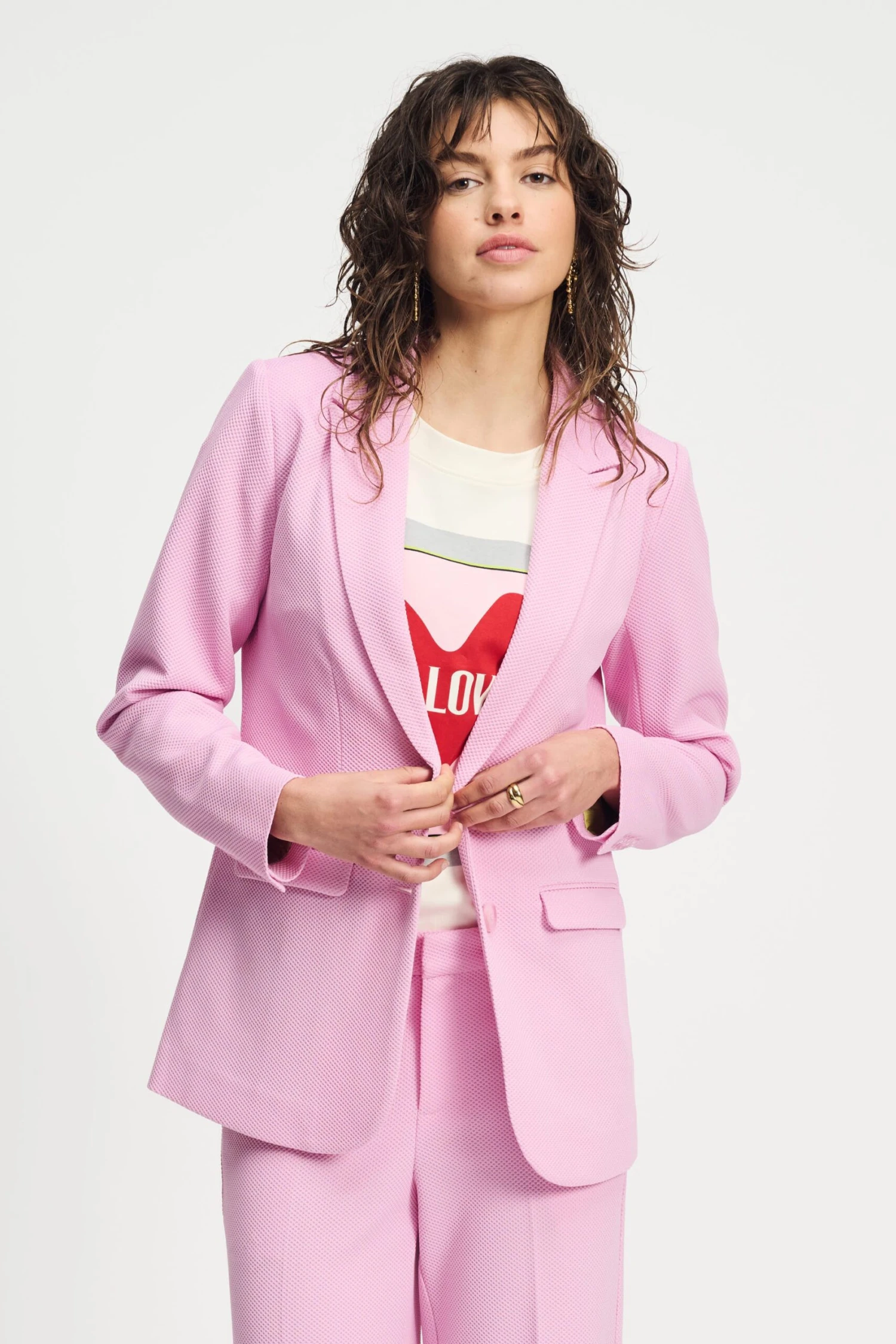 Discover this beautiful light pink blazer in our popular Piqué fabric. This fabric consists of recycled polyester, making it ‘more sustainable’. Pair the blazer with the matching pants and complete your look.