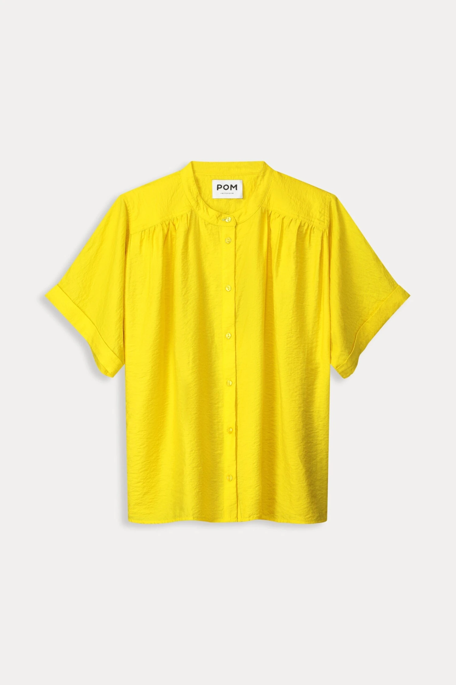 This yellow blouse has a front button closure and a landscape collar. The top has short sleeves and a boxy fit.