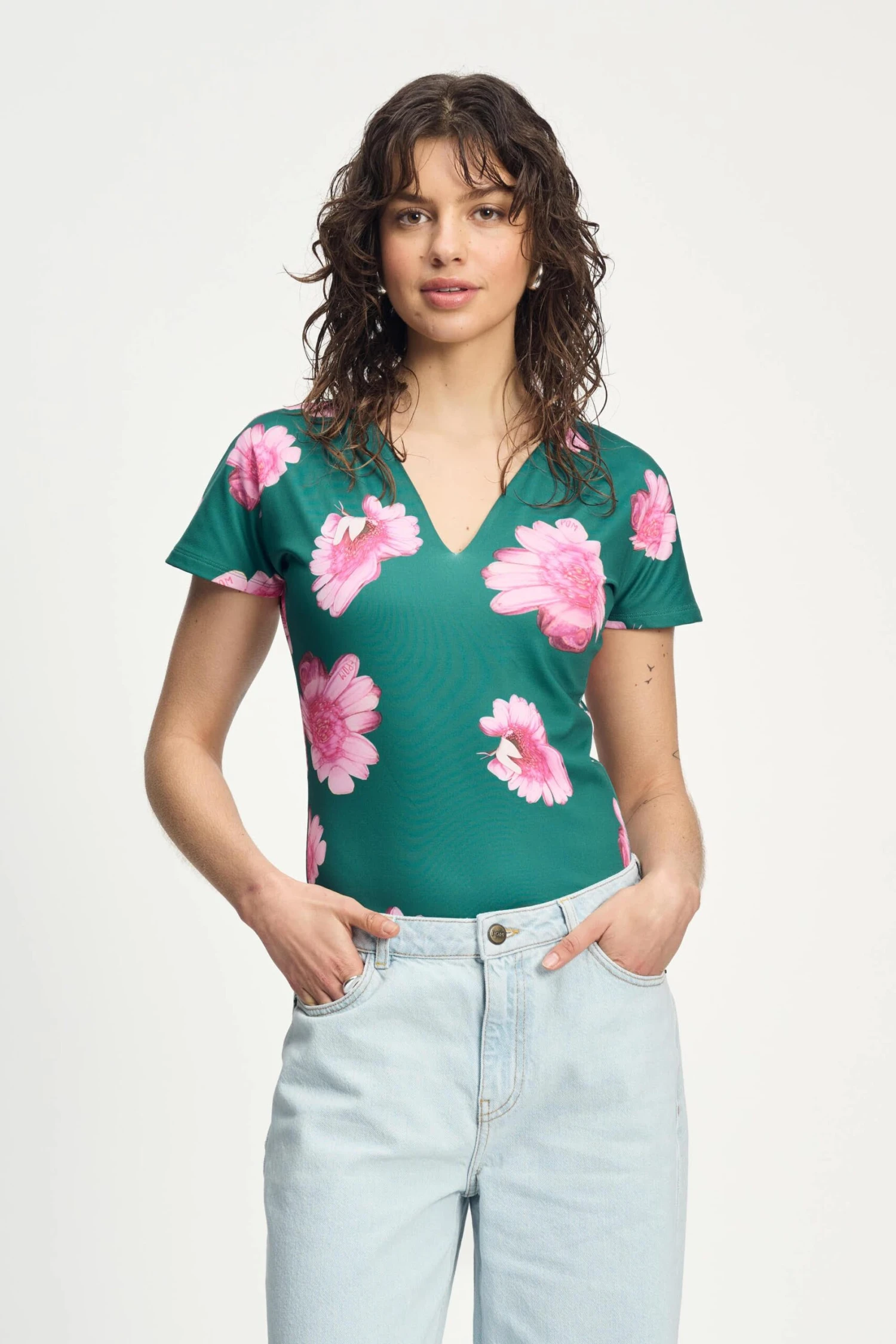 This green jersey body features a handmade floral print and an elegant heart-shaped V-neckline. The body is made from recycled polyester, making this item ‘more sustainable’. Perfect to combine with the wide leg Grey Storm jeans.