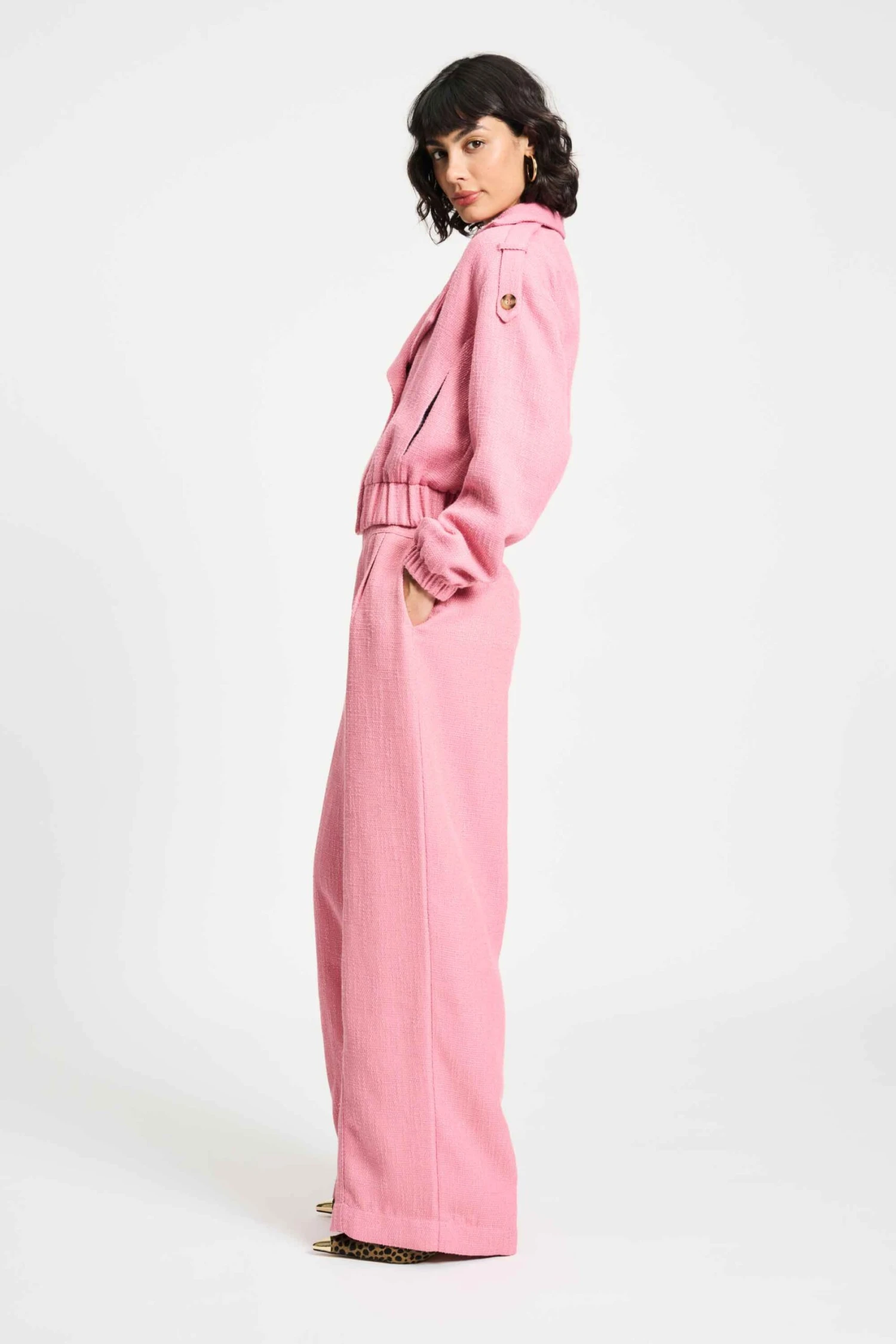 Color with character. This short pink jacket features a double-breasted closure, striking shoulders, and a colorful lining. Rugged yet soft.
