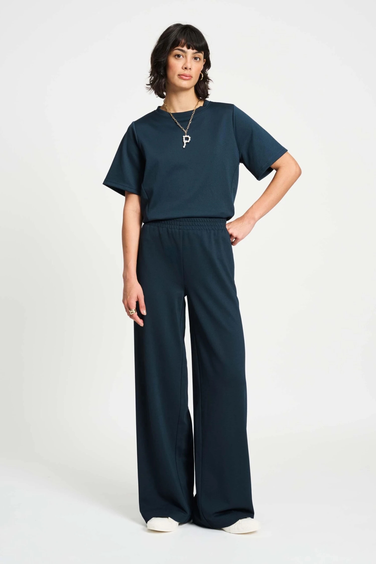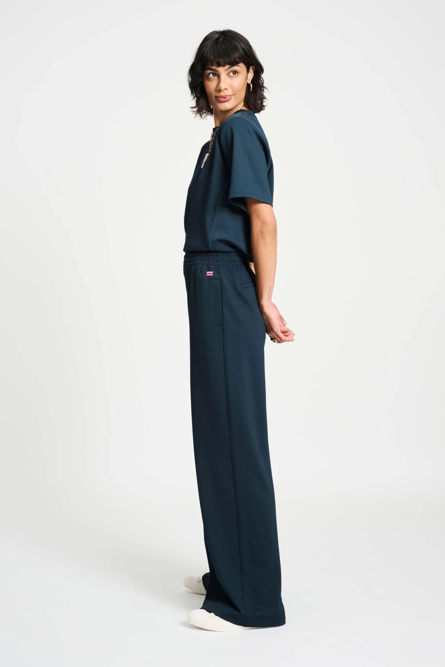 These blue trousers are both comfortable and elegant. The trousers are made of a soft, comfortable fabric that is also more sustainable. Pair these trousers with the matching top for the complete look.