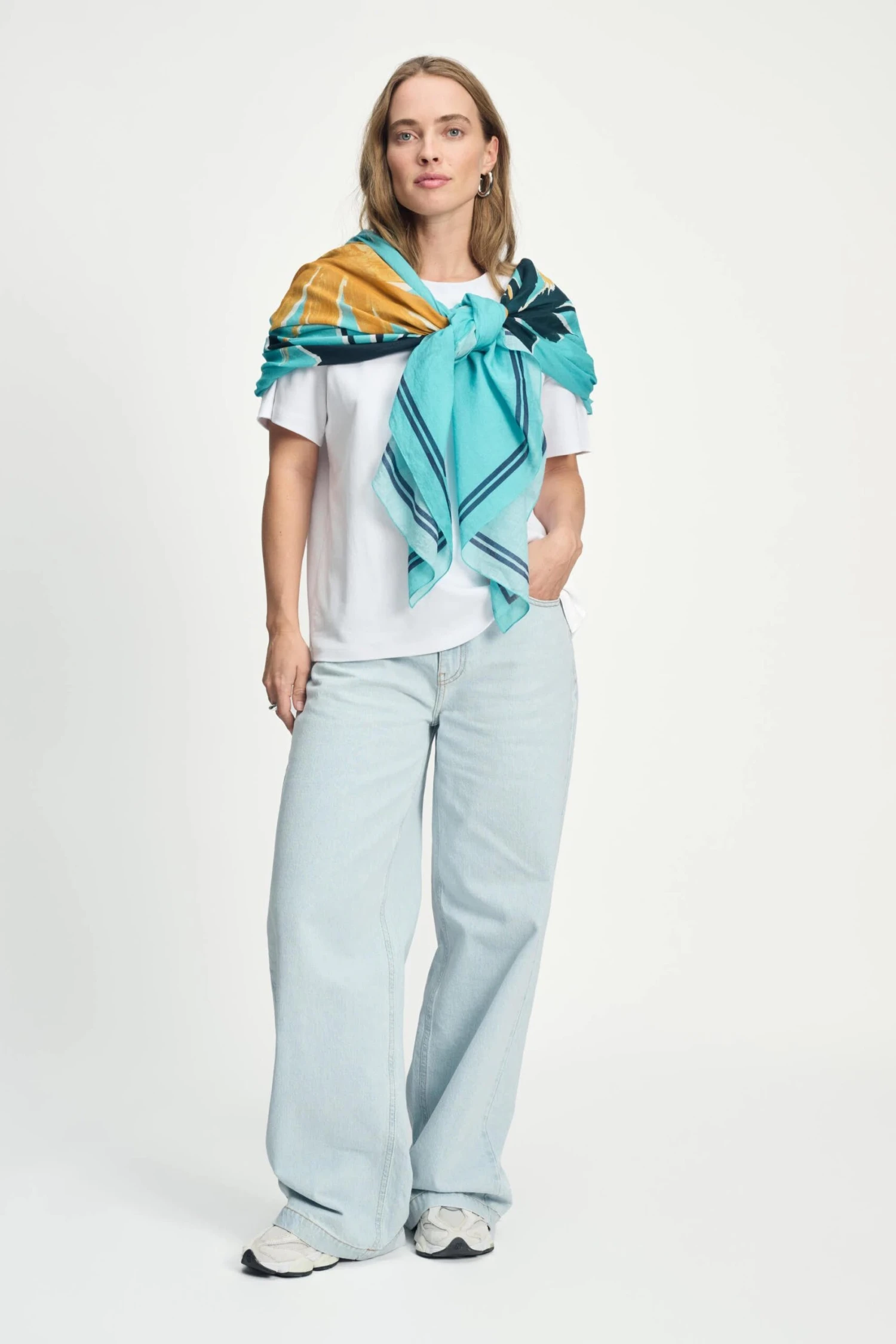 Discover this stylish blue shawl made of 100% organic cotton. Thanks to its breathable material, the shawl is extremely comfortable and ideal to wear in spring/summer. Add a touch of elegance to your outfit while enjoying the softness and airiness of this more sustainable choice.