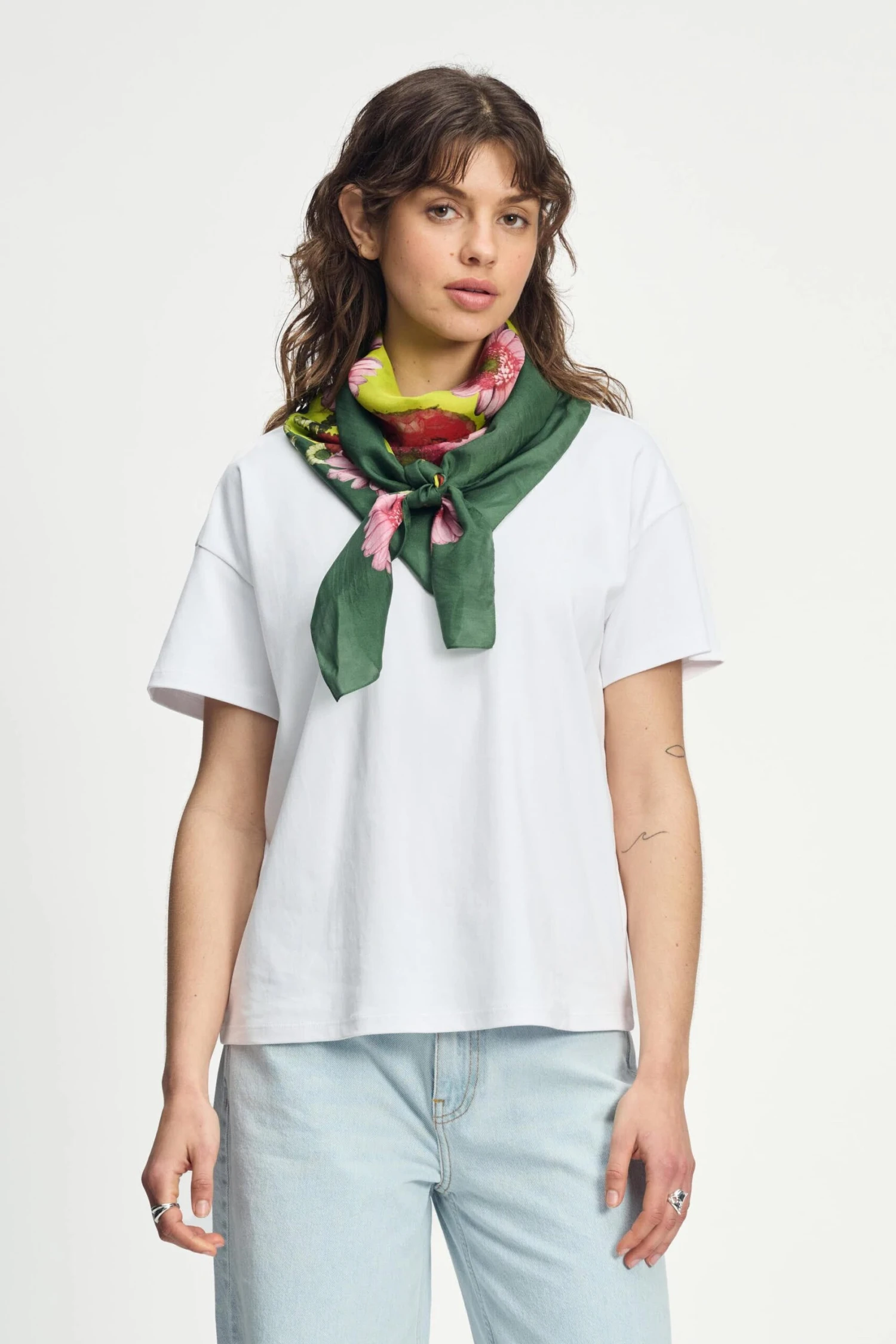 Discover the Bouquet Lime shawl with floral print. The shawl contains a beautiful color combination of pink, green and lime. The petite shawl is made of 100% silk and measures 110 x 110 cm.