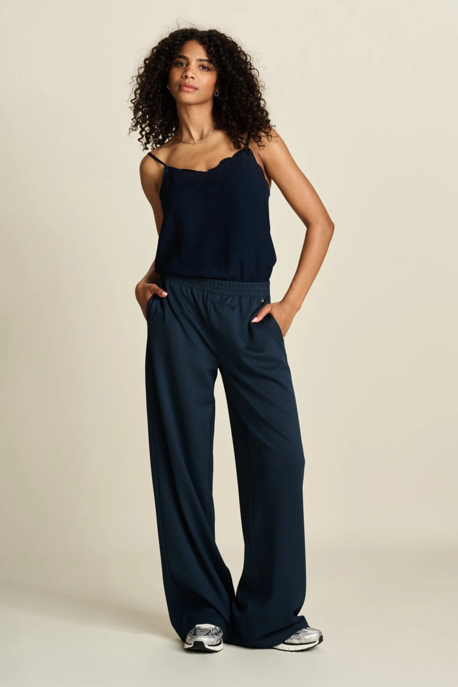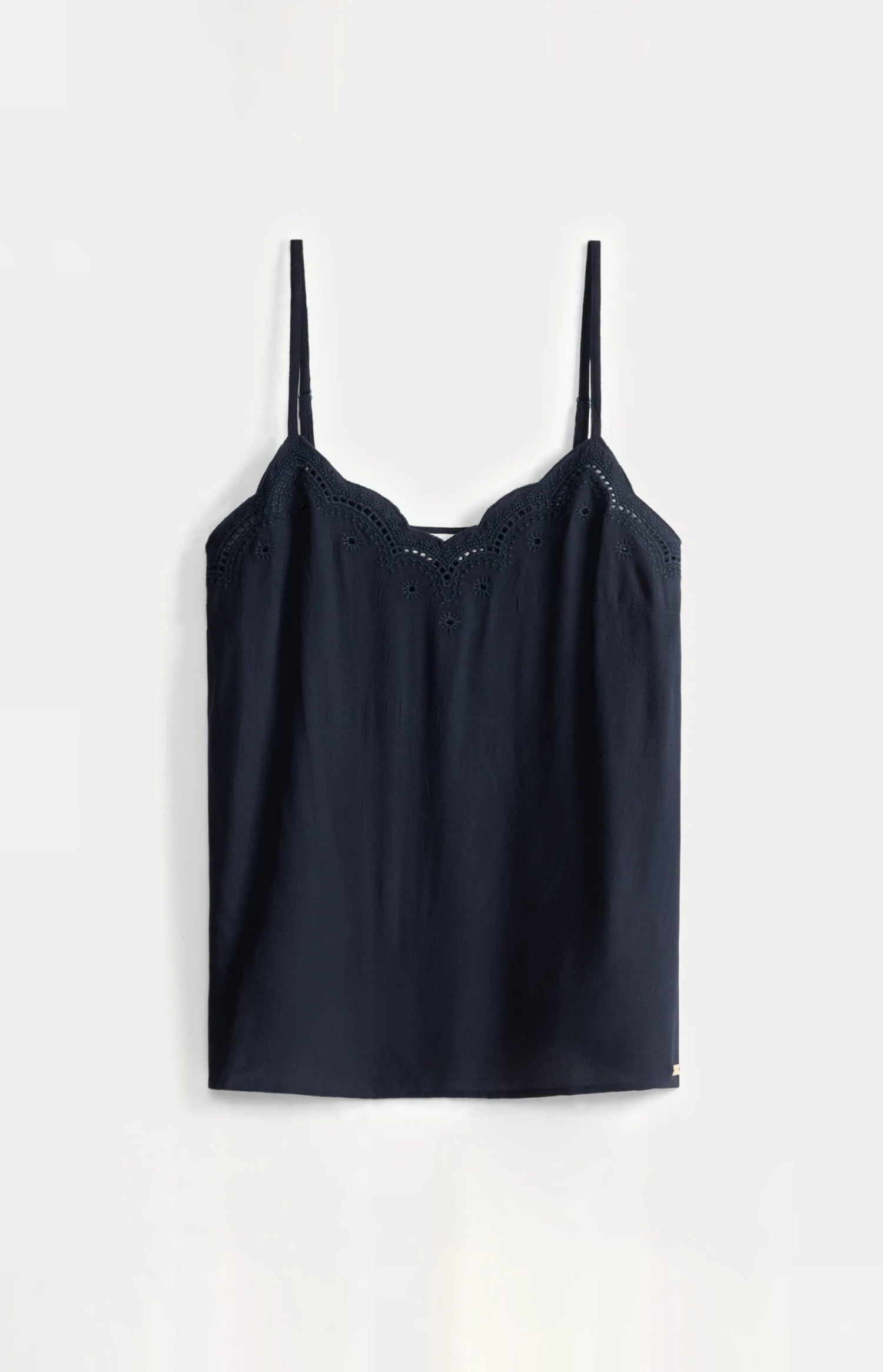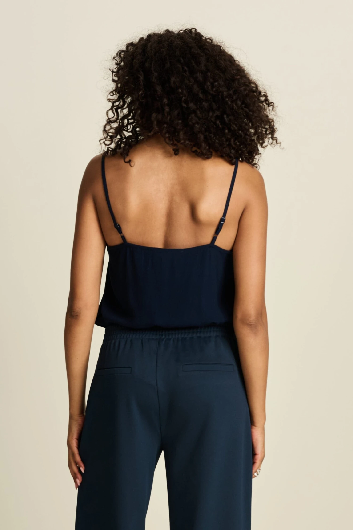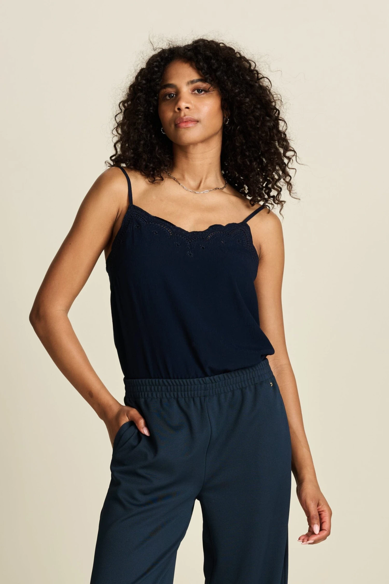 A beautiful top that can be combined in countless ways. The dark blue top, made of sustainable LENZINGâ„¢ ECOVEROâ„¢, has adjustable spaghetti straps and fine openwork details along the V-neck. You can wear it casually with jeans or dress it up with a skirt or a pair of smart trousers. Wear it underneath a sweater to show off the elegant embroidery neckline.