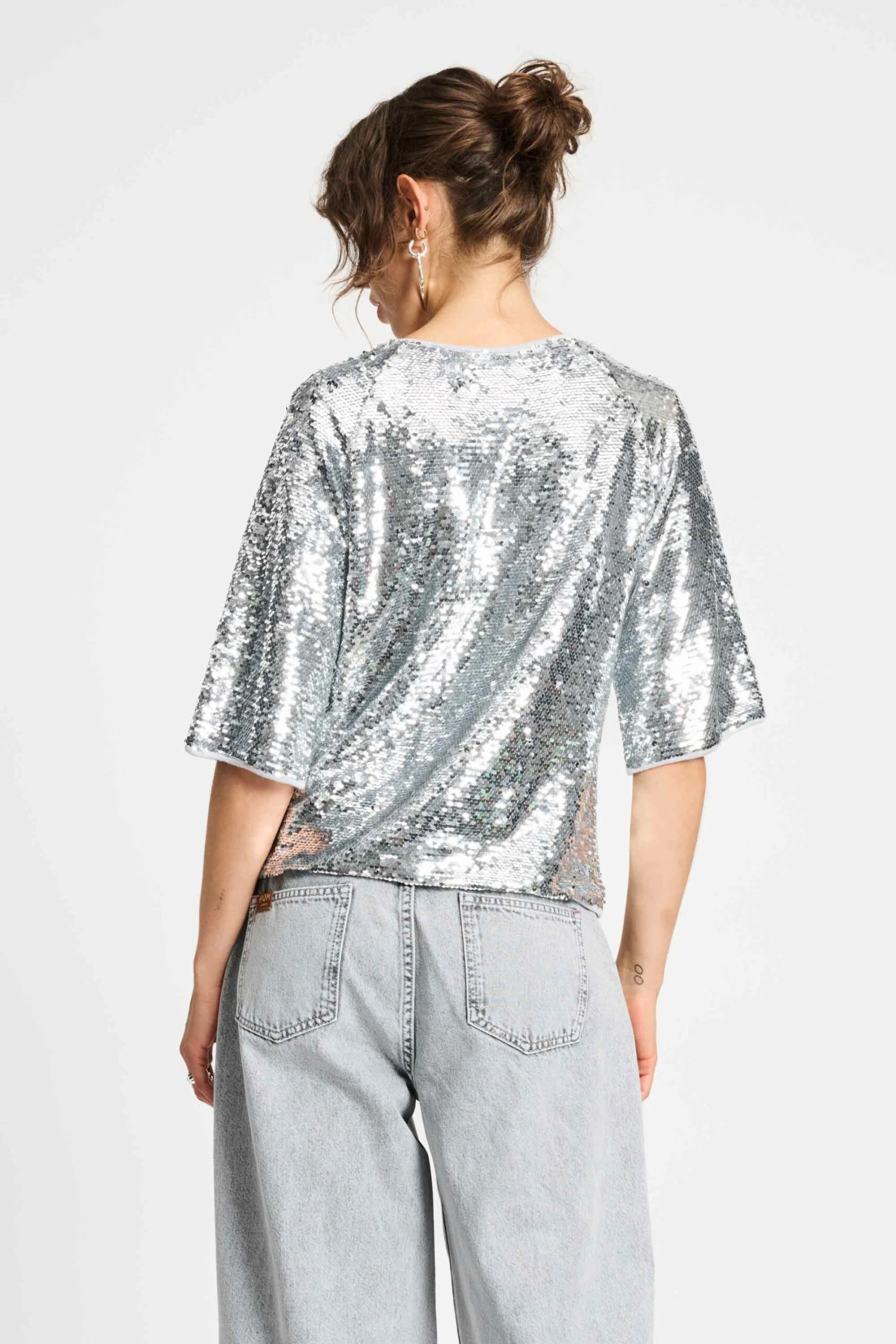 All eyes on shimmer. This silver sequin top is made for party nights and flashy outfits. The boxy fit and jersey lining ensure a comfortable fit, while the shimmer does the work.