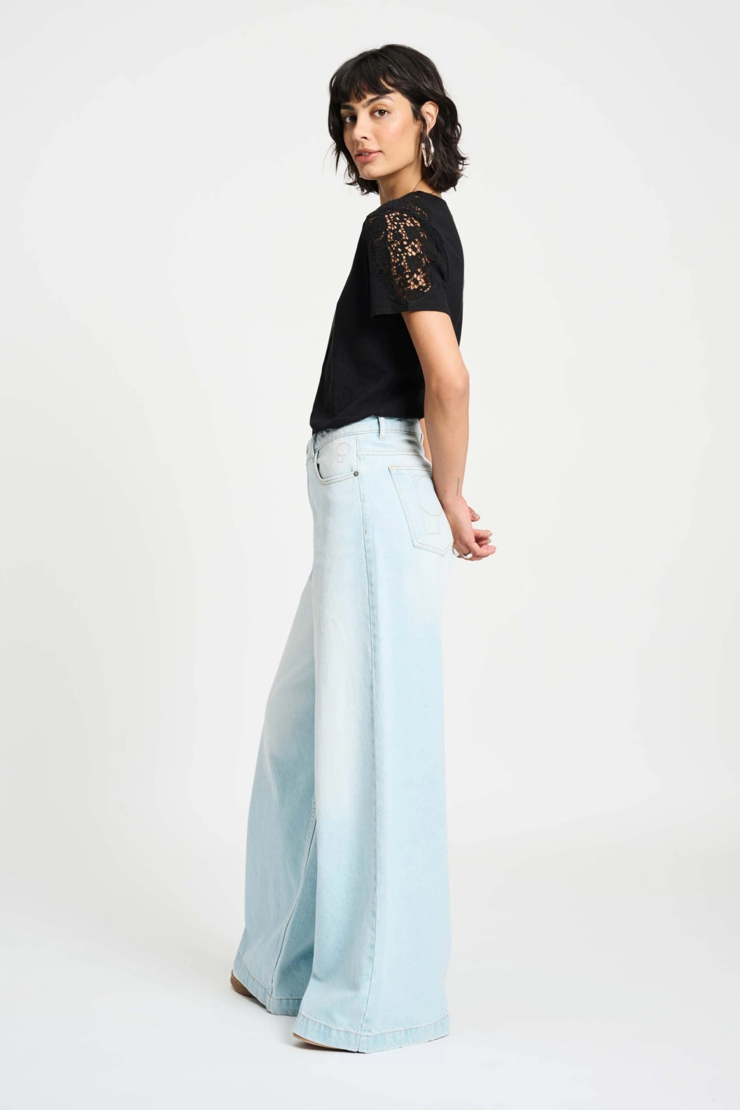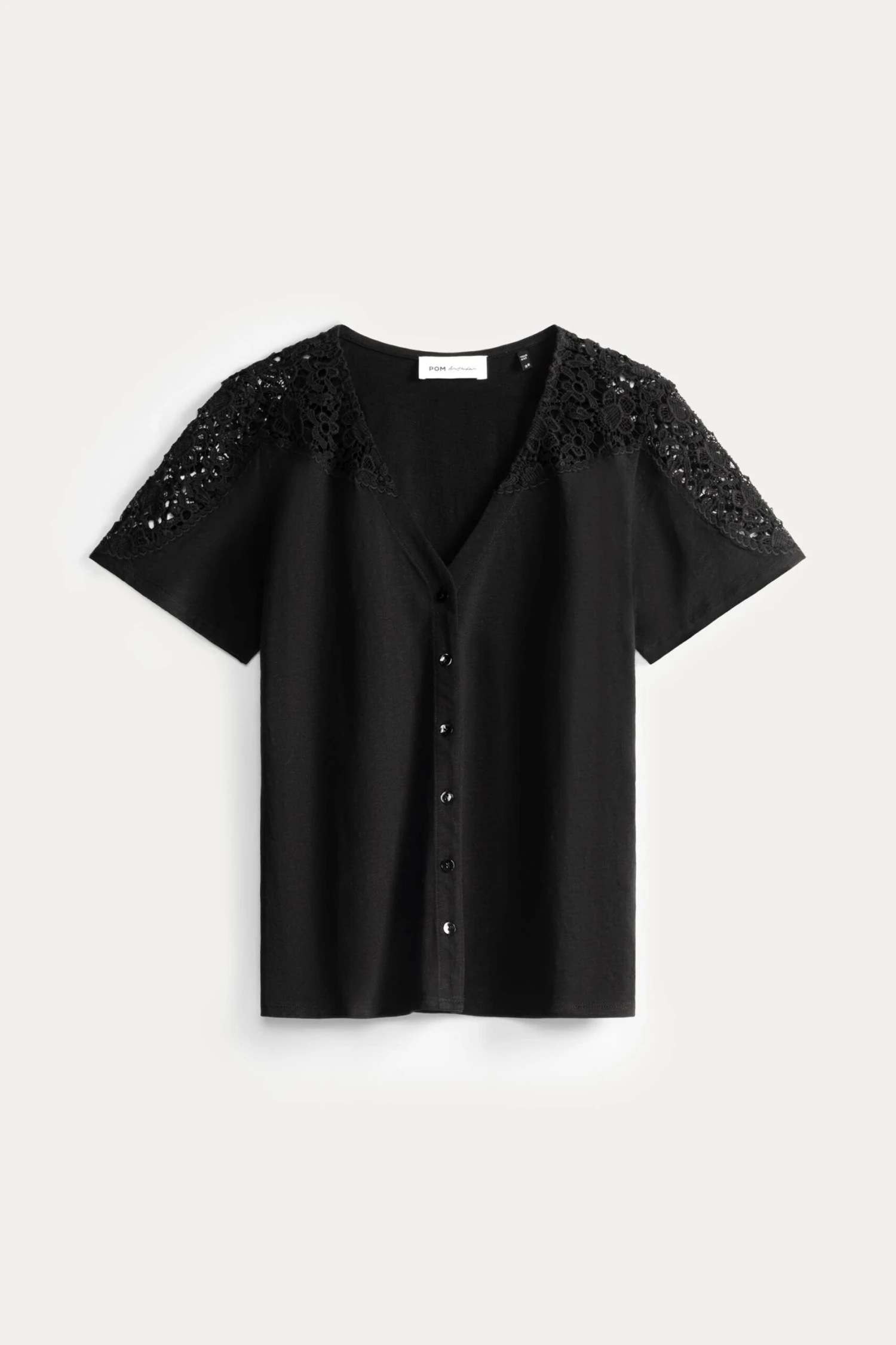 A perfect mix of casual and chic! This black t-shirt should not be missing from your wardrobe. While the V-neckline with lace gives the t-shirt an elegant look, the loose cut gives it a casual feel. Button the t-shirt up using the row of buttons at the front.